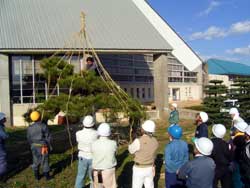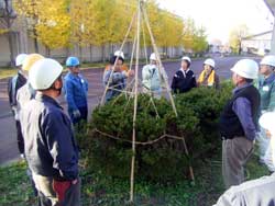 | 四日目は千秋が原管理棟で雪囲いの実技指導と実習を行いました。ここではまず |