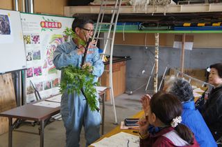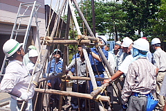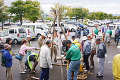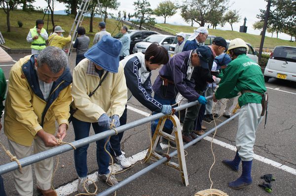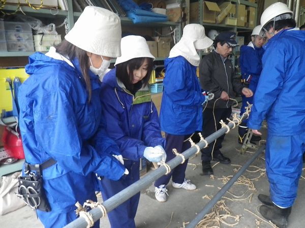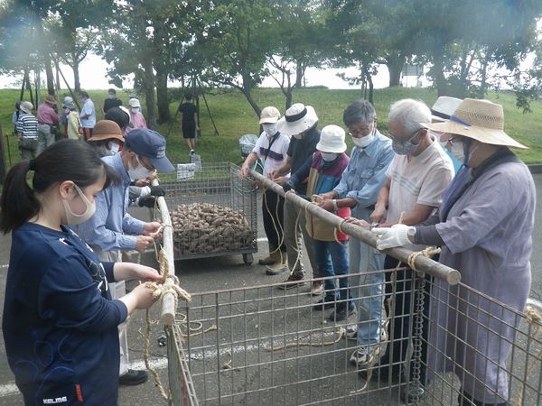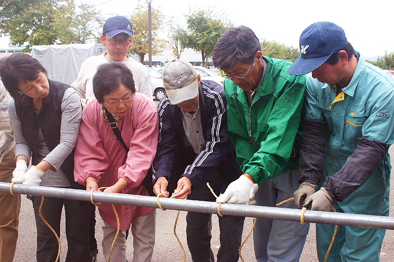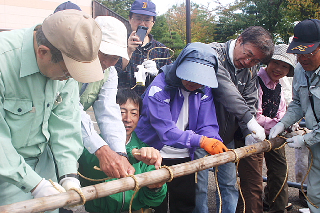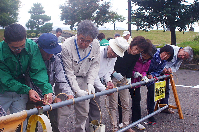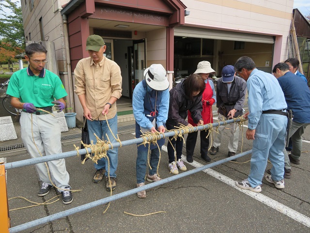冬囲いの基礎となる男結びを受講者のみな