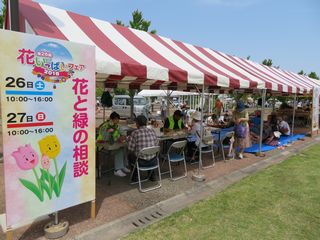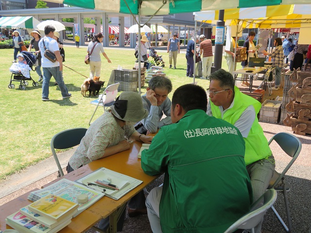 真夏日の中、花と緑の相談コーナーを開設、